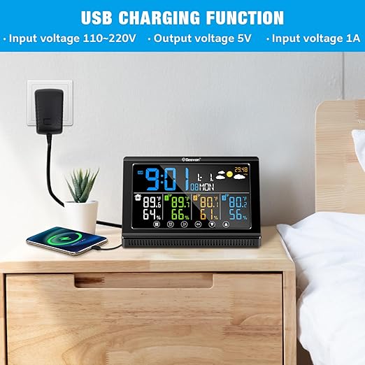 - 【Wireless Weather Station with Color HD Display and Vivid Digit】Geevon Outdoor Weather forecast station adopts a large 7.6'' LCD screen. This design provides users with 350° wide view angles. The included USB port can help charge your mobile phones, tablets and other electronic devices.