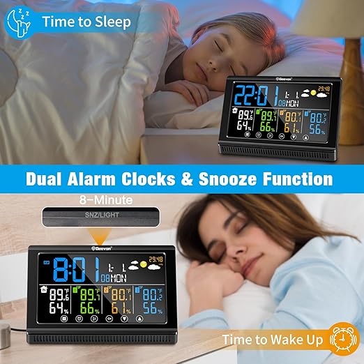 - 【Multi-functional Home Weather Station with Modern Design】 Geevon indoor outdoor weather station has comprehensive function, such as inside outside temperature and humidity detection, time & date display, dual alarms setting, weather forecast, barometric pressure, comfort indicator, and minimum/maximum records.