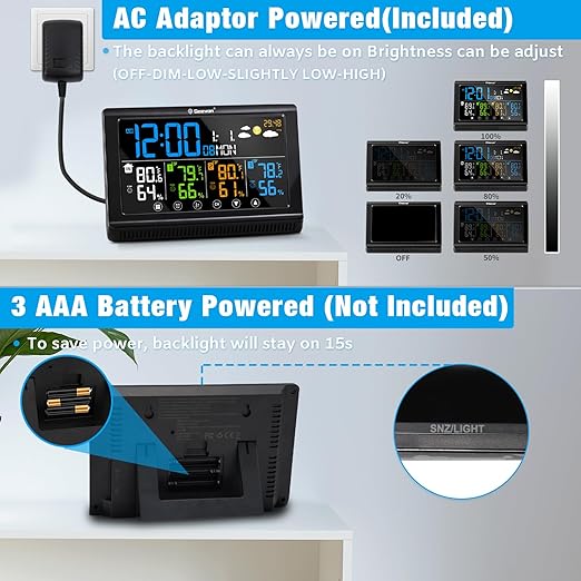 - 【2 Power Modes & 5-Level Brightness】Battery Powered weather station can be powered by the included AC adapter, or you can choose to use 3 AAA batteries (not included). If you need the backlight to stay on or adjust the brightness of the screen, it requires to plug in with the power cord.