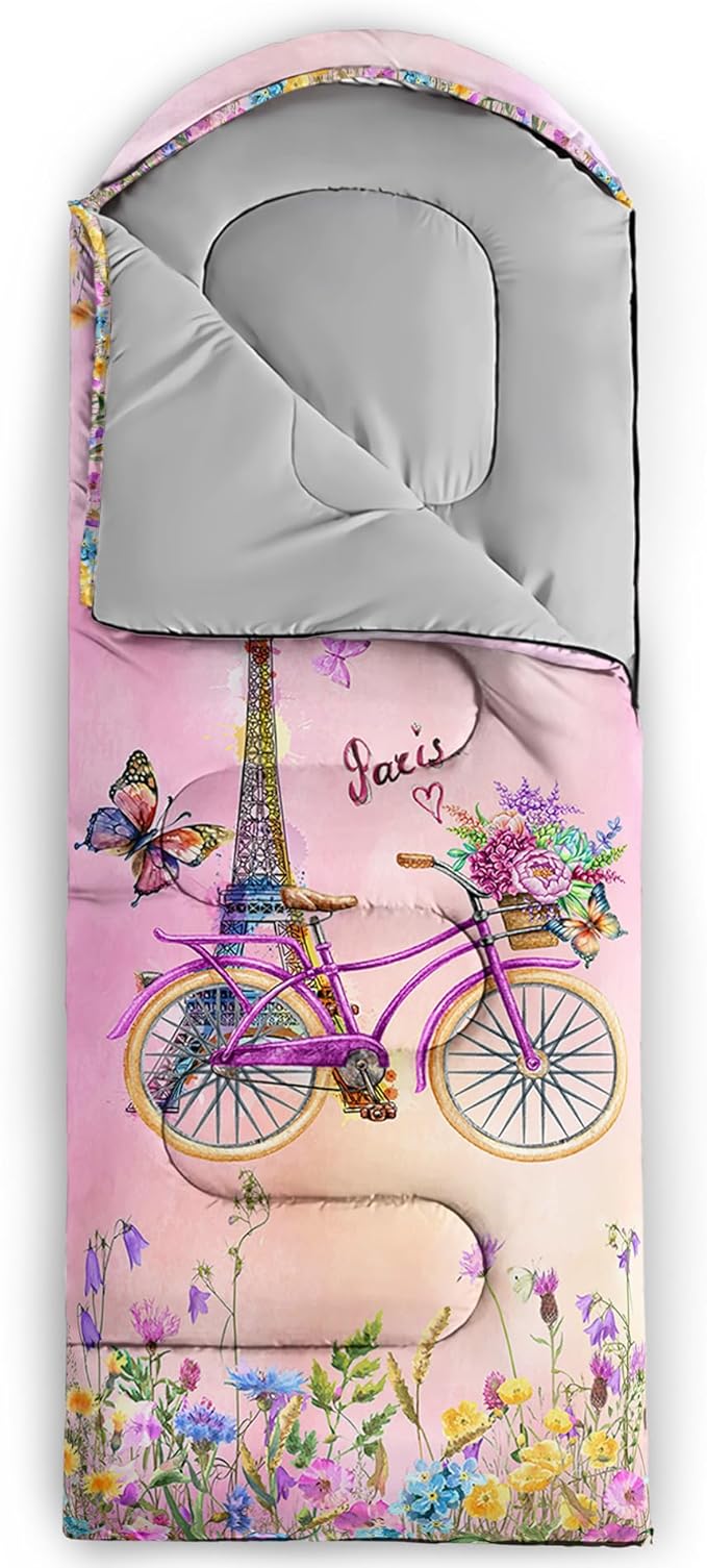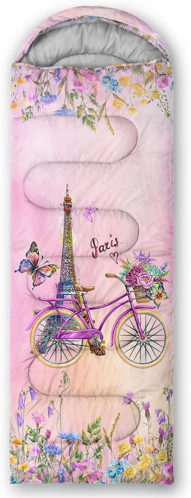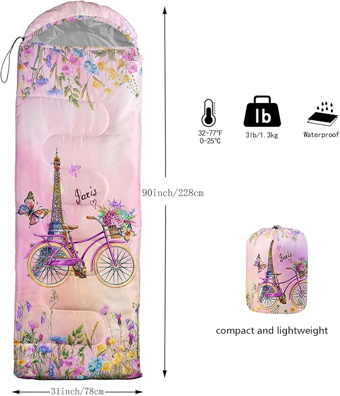 - 【Fits For 3 Seasons】: Size - 31 by 90 inches (W x D). Our Eiffel Tower sleeping bag can be used in 3 seasons with a design temperature of 32℉-77℉(0℃-25℃). These Pink Bicycle bags also have a weather resistant waterproof design to keep you warm and prevent you from any dampness.