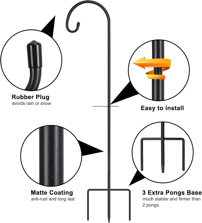 - ?? Base Prongs?‘This shephards hook has 3 long prongs at the bottom for better grip. Compared with ordinary 2 prongs products, it has higher stability and firmness. Even in bad weather, it can still stand upright and is not easy to fall down. We have thickened the metal pole, which not only increases the maximum bearing capacity, but also extends its service life.