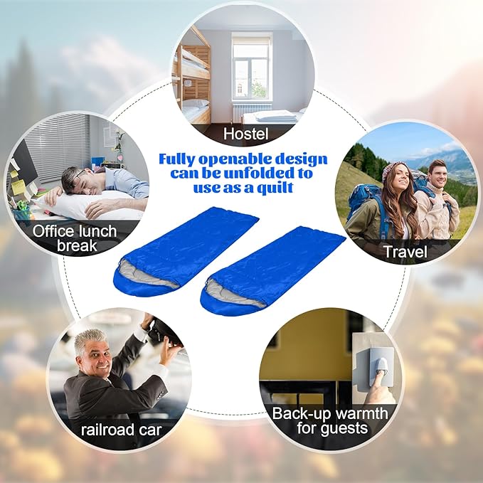 - Practical Design: the royal blue sleeping bag designed with double zipper at the bottom provide some freedom for your feet, bring a more comfortable experience; The half circle hood with adjustable drawstring to help keep your head warm even in the coldest climates, allowing you to enjoy a comfortable sleep