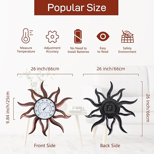 26'' Large Outdoor Thermometer, Premium Metal Sun Wall Thermometer Hygrometer No Need Battery, Decorative Indoor Outdoor Thermometer for Patio, Backyard, Garden, Living Room (Retro)