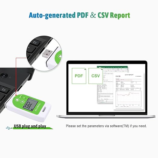 - PDF Report Temp Recorder USB: USB port, auto-generated PDF and CSV reports, no software required; If the reports need password protection, set it via the software; Reusable temp logger, easy to use, small and portable, supports switching ℃/℉ via the software