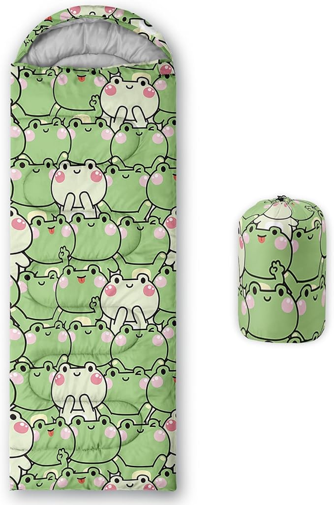 - 【Fits For 3 Seasons】: Size - 31 by 90 inches (W x D). Our Cartoon Frog sleeping bag can be used in 3 seasons with a design temperature of 32℉-77℉(0℃-25℃). These Green Frog bags also have a weather resistant waterproof design to keep you warm and prevent you from any dampness.