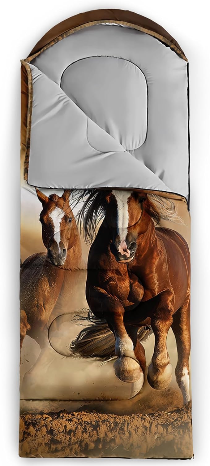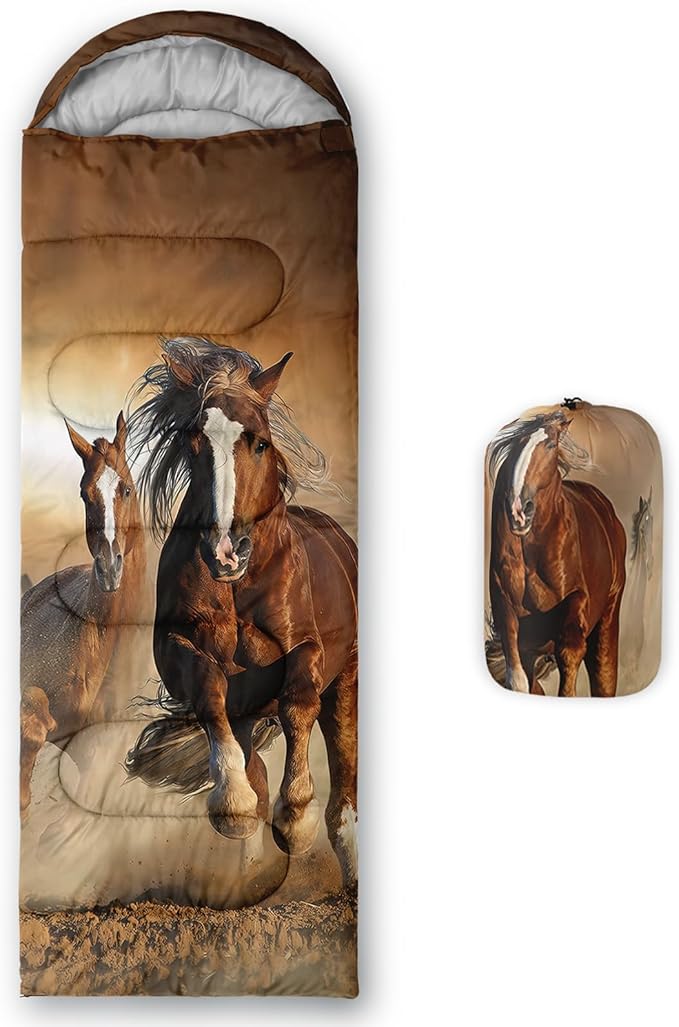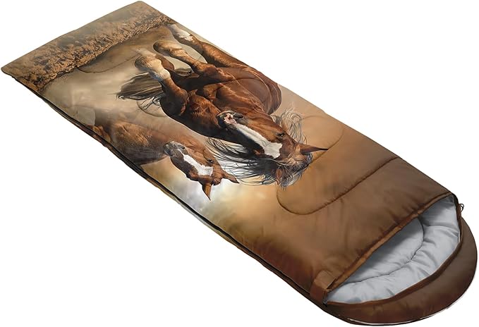 - 【Fits For 3 Seasons】: Size - 31 by 90 inches (W x D). Our Brown Horse sleeping bag can be used in 3 seasons with a design temperature of 32℉-77℉(0℃-25℃). These 3D Running Horse bags also have a weather resistant waterproof design to keep you warm and prevent you from any dampness.