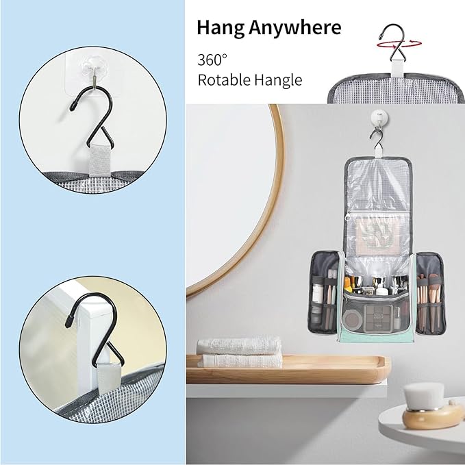 - Sturdy Metal Hooks: The sturdy hooks allow you to hang your toiletry bag on any hook, door, rod, etc. and can be rotated 360° for easy access