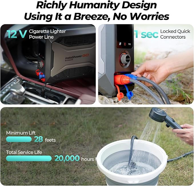 - 【All-in-one Solution】The efficient brushless 12V pump with a 6.6 ft hose ensures reliable and consistent water pressure, delivering an enjoyable shower experience. Furthermore, the shower unit features an automatic ignition system for easy start-up and shut-down, allowing you to pause your shower without constantly turning the machine on and off, saving water and energy. The adjustable shower head with 3 spray pattern settings enables you to control the water flow according to your preference.