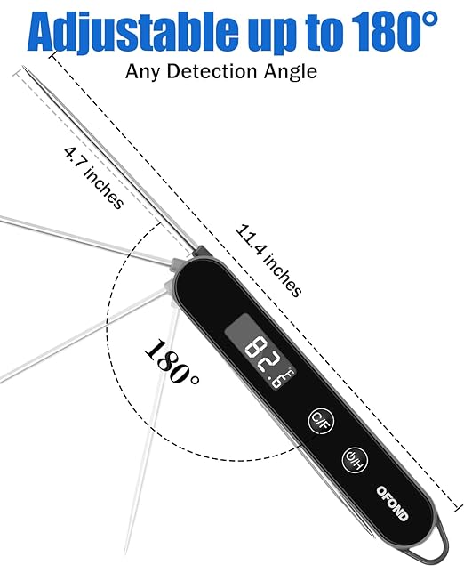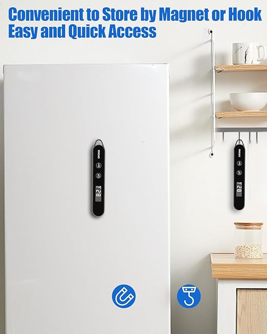 - Magnetic & Hang: OFOND digital cooking thermometer with a magnetic suction on the back and a hanging hole on the top, meat thermometer can be attached to the refrigerator, oven, or hanging stored. The long handle design is easy to grip, hands no need to be too close to the heat source when measuring temperature.