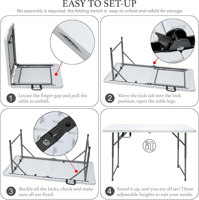 - Durable 4' folding table adjustable height:Small folding table 4ft combines durability with portability. Made from high-quality materials, this portable folding table is easy to transport and store. Ideal for events, it serves as a reliable folding table for outside and indoor gatherings.
