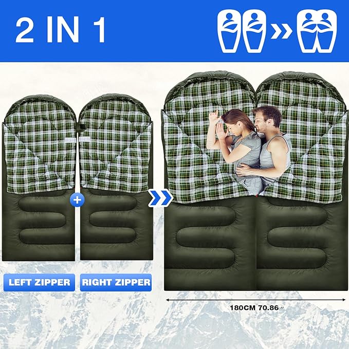 - Spacious and Comfort: This sleeping bag measures (78.74+11.81)*35.43 inches and weighs 7.05 pounds. It is larger than a regular sleeping bag, providing more room for you to move around and is also great for XXL individuals. It comes with a compression bag, making it easy to pack and carry for any outdoor adventure