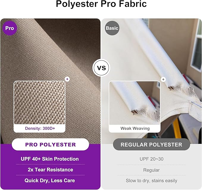 - Premium Polyester Pro Canopy: Features 2X tear-resistant fabric with 3 years fade resistance, quick-drying and easy to clean. Withstands sun, rain and wind while resisting wrinkles and shrinkage for lasting durability.