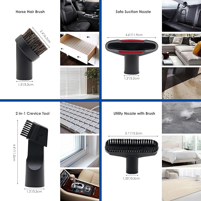 - DURABLE MATERAIL & WIDE APPLICATION: Crafted from premium ABS plastic and natural horsehair, these vacuum accessories for shop vac ensure long-lasting performance. Brush attachment for shop vac are versatile and suitable for various surfaces like carpets, hardwood floors, sofas, vents, cars, and pet hair removal