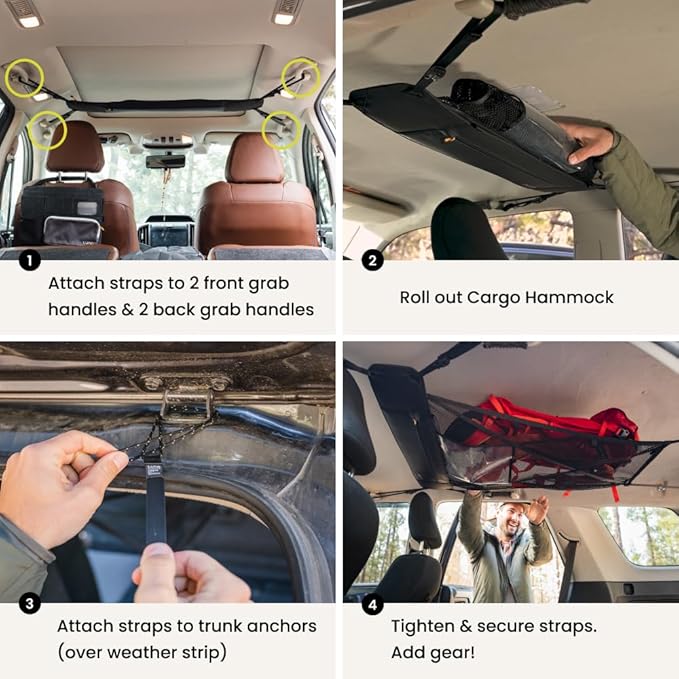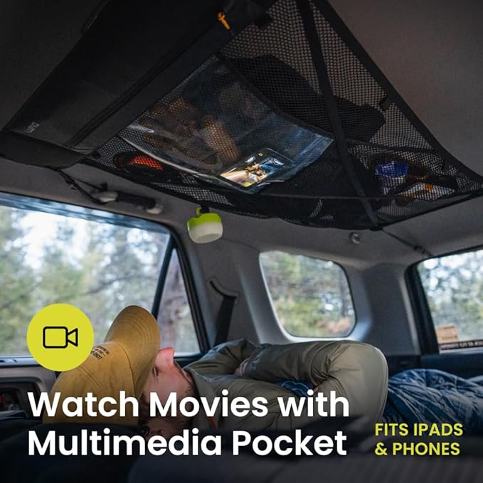 LUNO Ceiling Cargo Net - Car Roof Storage w/Multiple Pockets, Hangout Loops & Tab Pocket for Long Road Trip & Camping - 36" x 52" Car Camping Essentials Organizer for SUV - XL