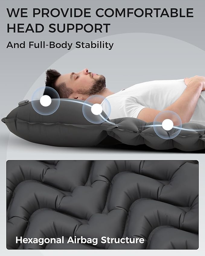 - EXTRA WIDE & 6.3-INCH THICK SLEEP SUPPORT – ENJOY RESTFUL COMFORT: Designed for ultimate comfort, this sleeping pad offers an extra-wide 77" x 27" x 2.4" surface and a 6.3" inflatable pillow for optimal neck support. The 2.4-inch thickness provides the perfect cushioning to keep you off the ground, while maintaining a compact and lightweight design. With an ergonomic shape and wave-pattern surface, it evenly distributes pressure for superior support, ensuring a restful night outdoors.