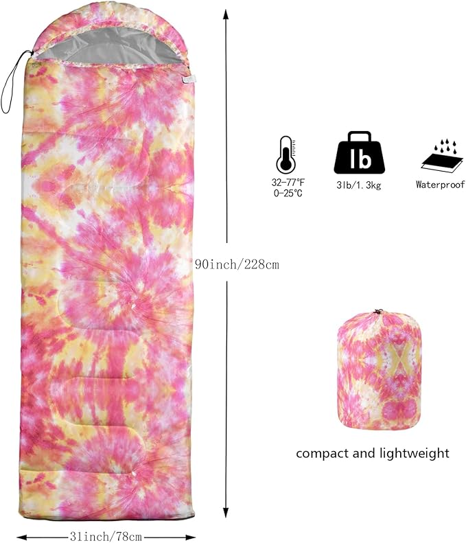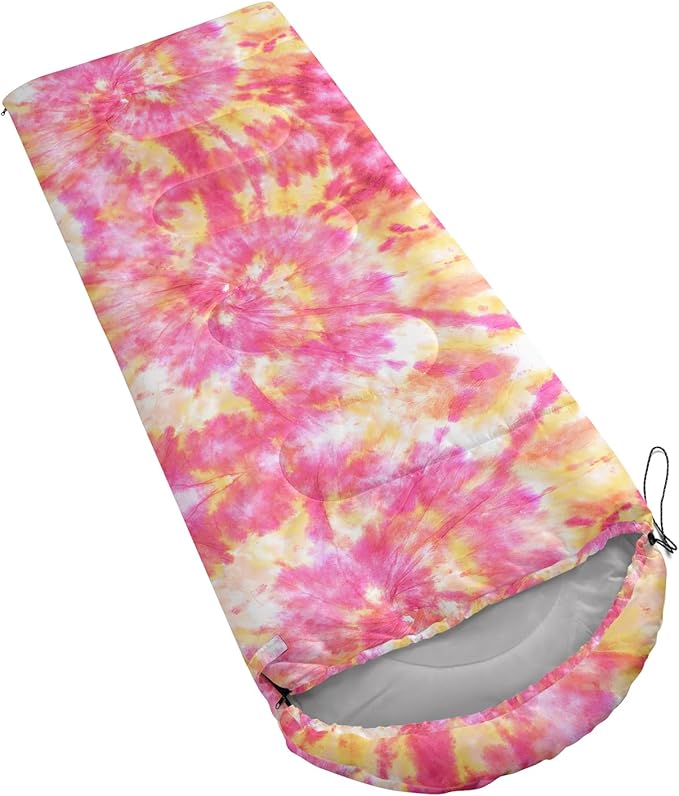 - 【Fits For 3 Seasons】: Size - 31 by 90 inches (W x D). Our Pink Psychedelic Tie Dyed sleeping bag can be used in 3 seasons with a design temperature of 32℉-77℉(0℃-25℃). These Pink Spiral Swirl bags also have a weather resistant waterproof design to keep you warm and prevent you from any dampness.