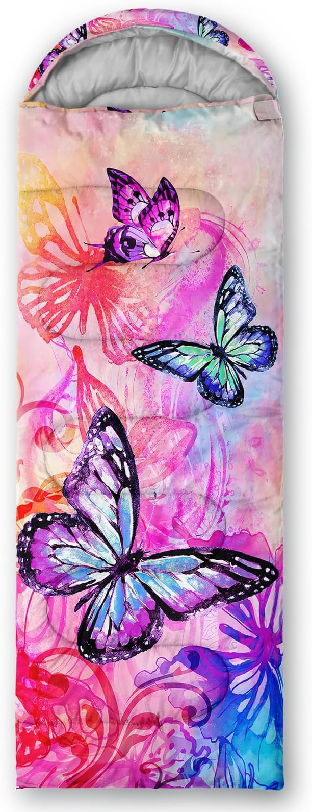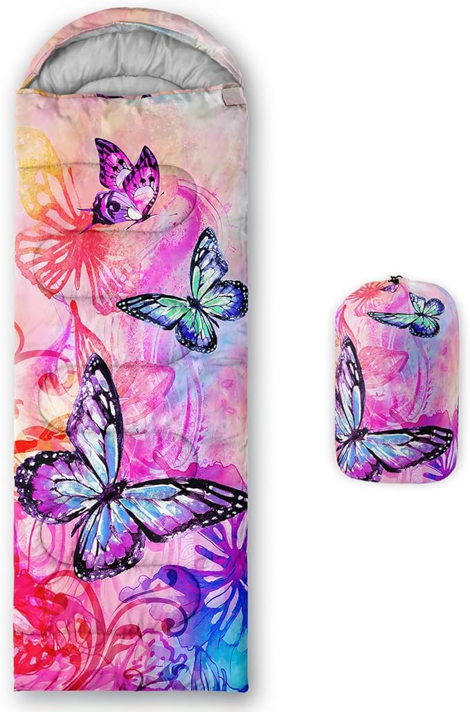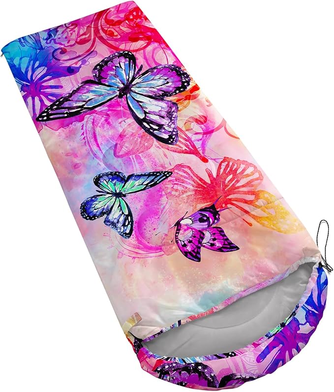 - 【Fits For 3 Seasons】: Size - 31 by 90 inches (W x D). Our Beautiful Blue Butterfly sleeping bag can be used in 3 seasons with a design temperature of 32℉-77℉(0℃-25℃). These Tie-Dye Art Style bags also have a weather resistant waterproof design to keep you warm and prevent you from any dampness.