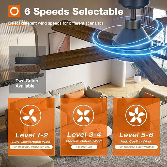 - Reversible DC Motor: The high-quality & high-speed motor brings a perfect wind experience. The wind speed can be adjusted in 6 gears, you can choose between comfortable wind, natural wind and strong wind. Reversible dual-direction fan improves air circulation to keep you warm in winter and cool in summer. Our fan blades are double sided in different colors, one side is black and the other side is walnut. Choose the fan blade color that best fits your home decor!