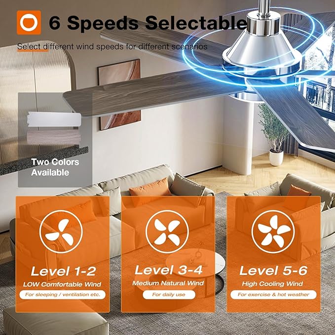 - Reversible DC Motor: The high-quality & high-speed motor brings a perfect wind experience. The wind speed can be adjusted in 6 gears, you can choose between comfortable wind, natural wind and strong wind. Reversible dual-direction fan improves air circulation to keep you warm in winter and cool in summer. Our fan blades are double sided in different colors, one side is nickel and the other side is oak grain. Choose the fan blade color that best fits your home decor!