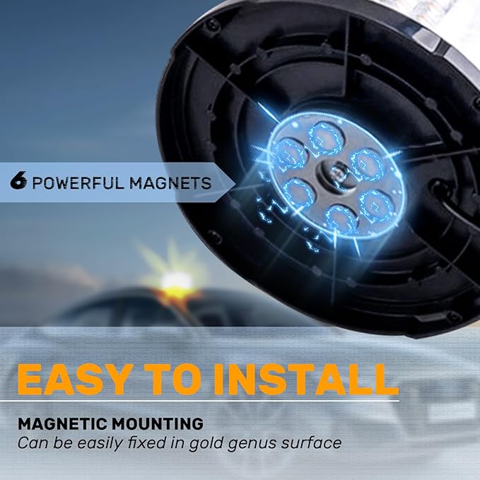 - 【Strong Magnetic Base】Nrgedzam's beacon LED amber lights there are a total of 6 high-strength super magnets at the base, which equipped with the larger size of the thick rubber suction cup, and it can be easily adsorbed on any metal surface. This rooftop beacon flashing lights can be quickly installed in 5 seconds or removed from any metal (driving speed up to 80 mph without falling off); Through a high-strength magnetic base, the beacon light not only meets the stable demands of such as road rescue and engineering vehicles, volunteer, but is also applicable to various types of vehicles.