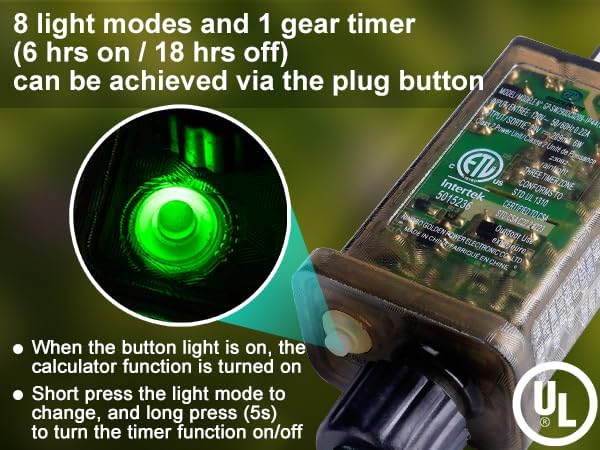 - UL Certified Plug:UL Listed low voltage plug is safe to touch, very friendly for kids and pets. The transformer can adjust lighting mode( steady on & 7 flash lighing modes), also can switch timer function (6 hrs on, 18 hrs off).