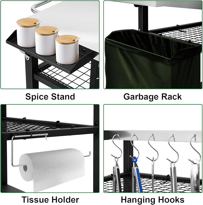 - Practical Flexible: The food prep cart table includes a paper towel holder, pull handle, bottle opener, 4 multi-functional tool hooks, etc. The grid partition of the grill table outside is not easy to accumulate dust and water, which is very convenient to clean.