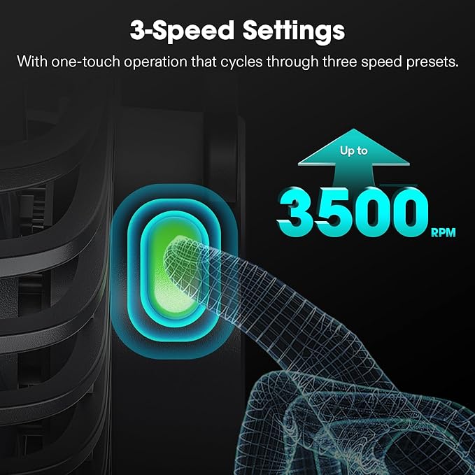 - 3-Speed Settings: With one-touch operation that cycles through three speed presets up to 3500 RPM, this compact fan offers tailored cooling customization; And with the integrated memory feature, your chosen fan speed is automatically retained if power gets disrupted