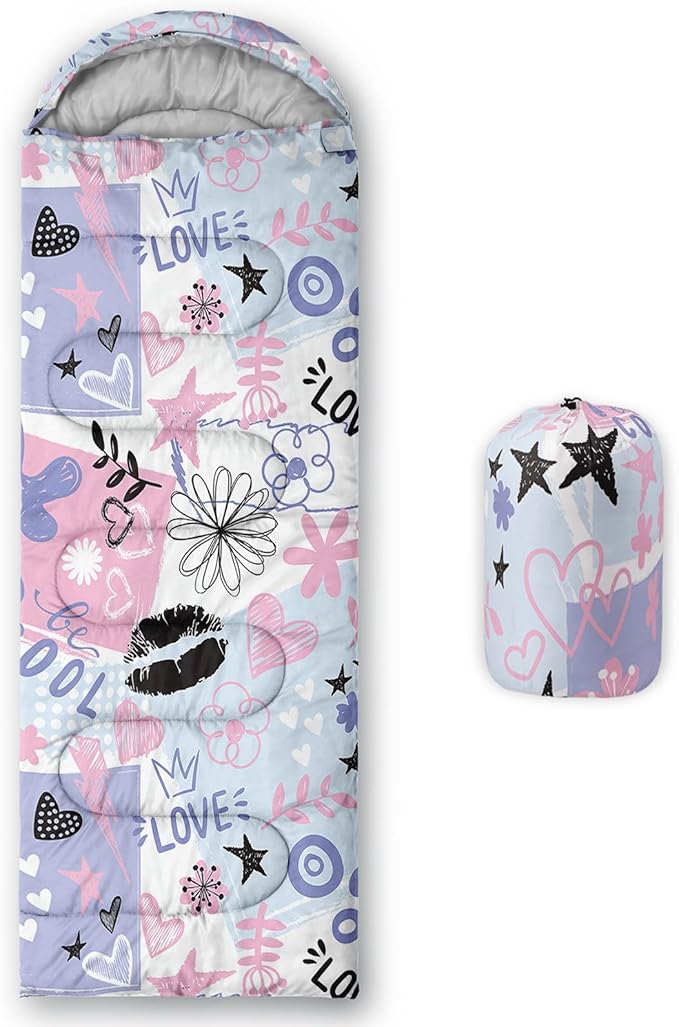 - SUITABLE:The sleeping bag can be used for 3 Seasons.SIZE:90.5"L x 31.5"W Suggenal extreme temperature: 41 ℉ -77 ℉.Applicable in a variety of scenarios,such as Travel camping pajamas party,It's very suitable for you to travel with your children.Half-circle hood with adjustable drawstring,which can keep you warm and prevent your humidity