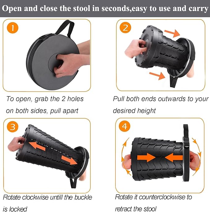 - [Easy to use,Multipurpose]:super easy to use.You can open the collapsible stool by holding both ends and pulling to open with slight turning them,perfect for indoors and outdoors.Indoor occasions such as the living room, bedroom,bathroom,kitchen,office.Outdoor activities:drawing room,garden,hiking,BBQ,camping,queue,fishing, kitchen, etc