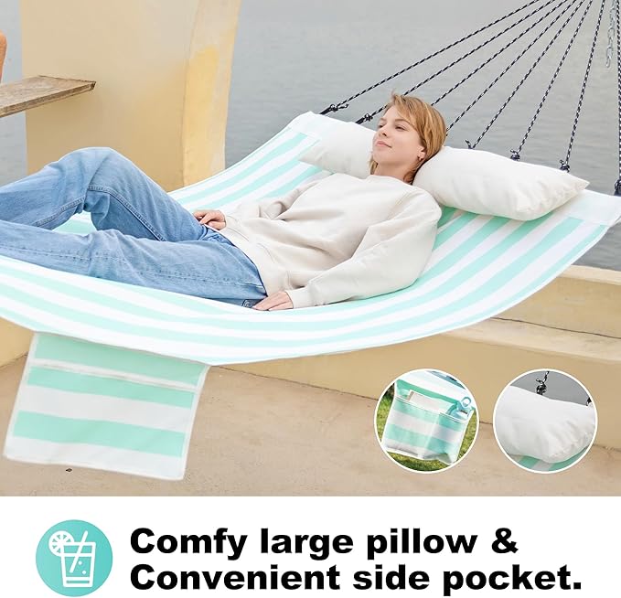 14ft Two Person Outdoor Hammock, Portable Camping with Folding Steel Spreader Bar, Carrying Bag, Carabiners, Tree Straps, Pillow & Sidebag, Quick Dry Textilene, 550 lbs Capacity (Cyan)