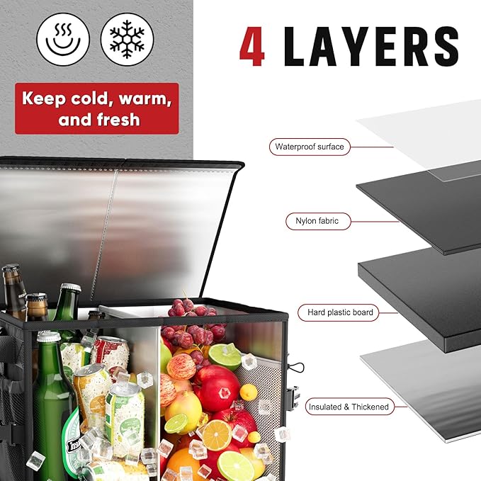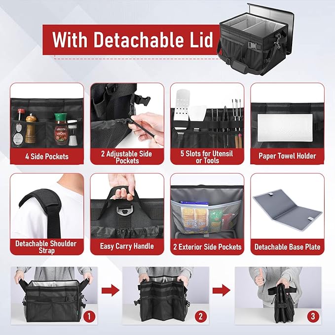 - Upgrade Lid Design: FANGSUN grill caddy features aluminum-coated interior and lid design, this caddy ensures insulation, keeping your items cool or warm while preventing dust from getting inside. Plus, the lid is detachable and collapsible for added convenience. Elevate your grilling experience with this versatile and functional accessory