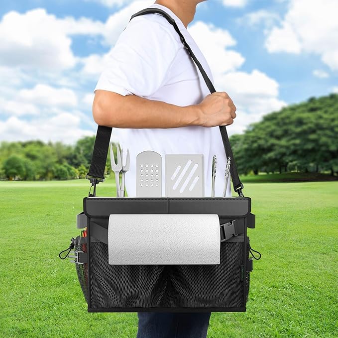 - Multifunctional Pocket: Measuring 15.8โร11.8โร10.6โ, the caddy features with 2 main roomy interior spaces to fit large items, 5 slots for cooking utensils, 2 adjustable mesh side pockets to accommodate larger items or retract openings to prevent item from falling out, 6 side mesh pockets and a paper towel holder. It easily holds spices, condiments, plate, cutlery, napkin, paper towel roll, grill tools, spoon, camping cups, and more