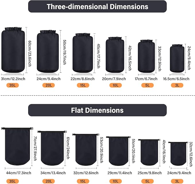 - Wide Variety of Sizes: we understand the varying requirements of our customers; Therefore, our waterproof dry bags are available in 6 different sizes to fulfill your needs, including about 35 L (27.95 x 17.32 inches/ 71 x 44 cm), 20 L (24.02 x 13.39 inches/ 61 x 34 cm), 15 L (21.65 x 11.81 inches/ 55 x 30 cm), 10 L (20.08 x 11.42 inches/ 51 x 29 cm), 5 L (16.14 x 9.84 inches/ 41 x 25 cm), 3 L (12.6 x 9.45 inches/ 32 x 24 cm); Please check the size before purchasing