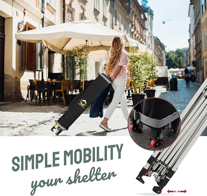 - STO’ N GO SYSTEM - Our lift-free storage and transport system makes it easy to collapse the canopy, cover it with the bag, and roll it away. The canopy can be stored with the fabric attached, with a specialized pocket for 8 stakes and 4 guy ropes. Integrated wheels in the feet allow easy movement even when the canopy is set up, by simply lifting the side without wheels. This feature is especially useful for quick setup and takedown at locations like the beach, park, or sports events.