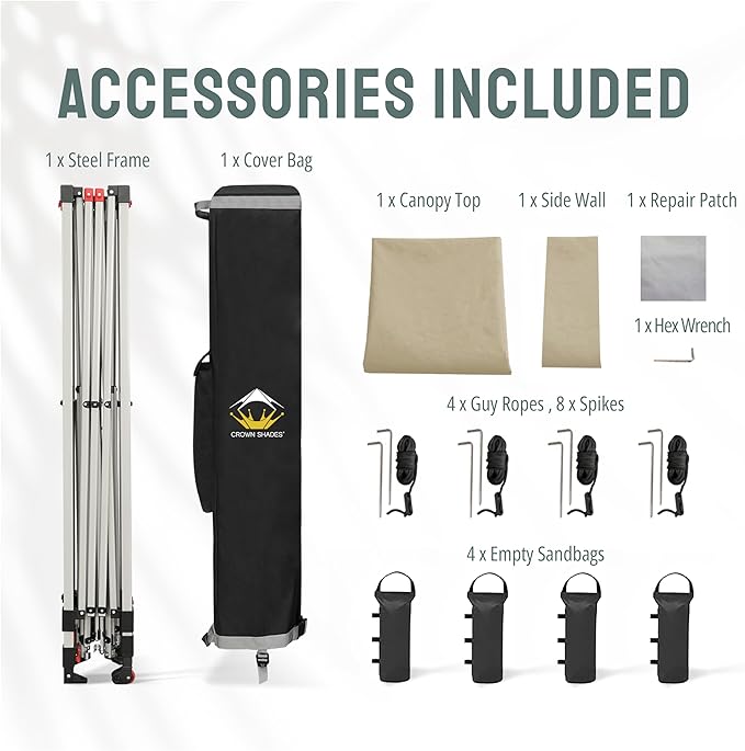 CROWN SHADES 12x12 Pop Up Canopy Tent Instant Commercial with 150D Silver Coated Fabric Including 1 Removable Sidewall, 4 Ropes, 8 Stakes, Weight Bags, STO 'N Go Bag, Beige