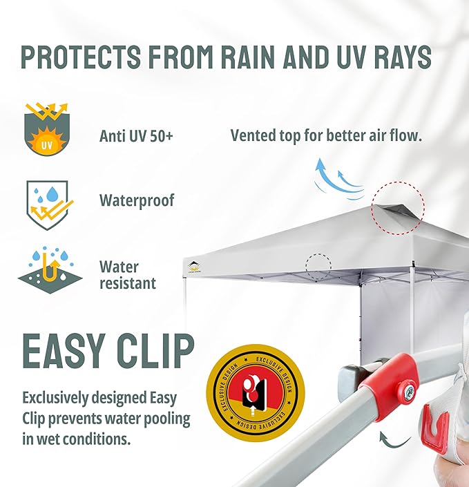 - FAST CLIP CANOPY FABRIC - The newly designed clip system makes it easy to attach the canopy fabric to the frame. The silver-coated interior provides exceptional UPF 50+ UV protection, ensuring cooler, safer shade. Made from rugged 150D fabric, the canopy is water-resistant and CPAI-84-rated for flame resistance. The canopy features integrated air vents, and the fast clip system prevents wind lift and rain pooling, reducing fabric tearing risks. Ideal for outdoor events, weddings, and gatherings.
