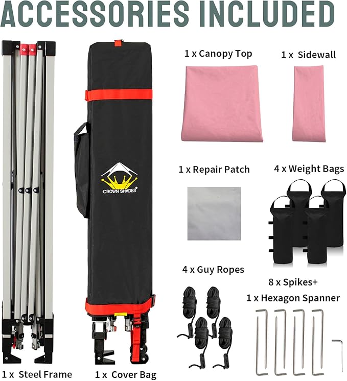 CROWN SHADES 10x10 Pop Up Canopy with 1 Side Wall - Beach Tent with One Push Setup - Outdoor Sun Shade for Events, Parties, Camping - Gazebo with STO-N-Go Cover Bag (Pink)