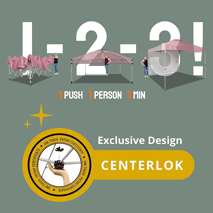 - ONE BUTTON EASY SET UP - Our 10x10 pop up canopy tent features patented one push center lock tech. With just a single push, the central hub locks the poles in place. Designed for the next generation, this outdoor canopy for patio can be set up by two people in seconds without any tools. Three adjustable height settings with soft, pinch-free buttons ensure convenience and safety, making it perfect for camping, beach outings, craft fairs, tailgating, farmer markets, outdoor BBQs, and more