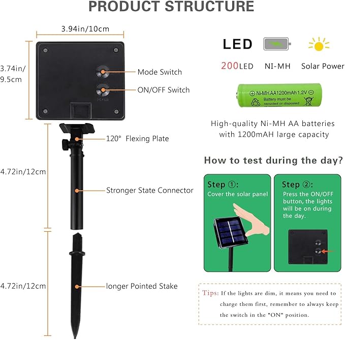- 8 Lighting Modes, Memory Function and Auto On/Off: These solar twinkle lights have the On/Off button and Mode button. You can select 8 different modes to satisfy your diverse needs by pressing the mode button. And the built-in memory chip saves your last modes setting, so there is no need to reset it again.