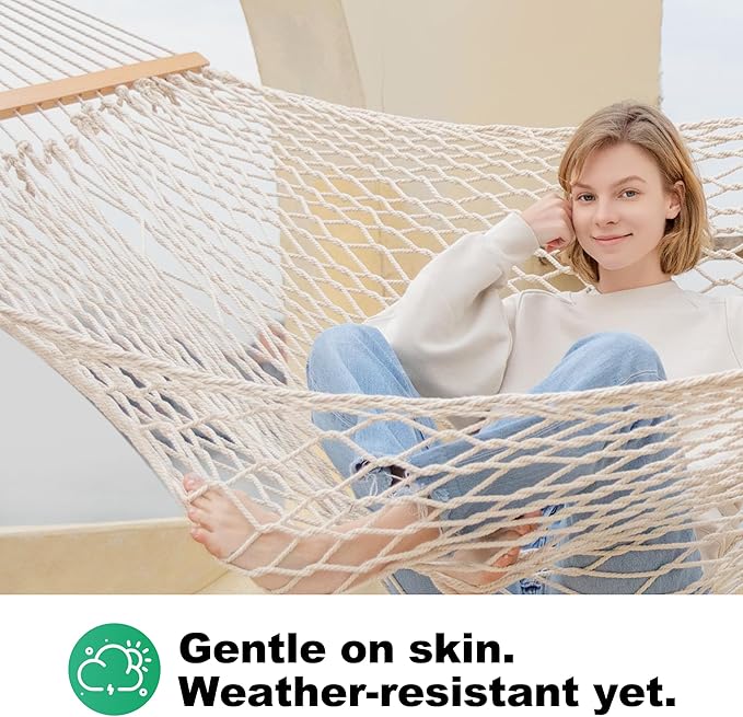 12ft Double Hammocks, Handwoven Traditional Cotton Rope Hammock with Hardwood Spreader Bar, Chains and Hooks for Indoor Outdoor, Max 450 lbs Capacity (Beige, Full)