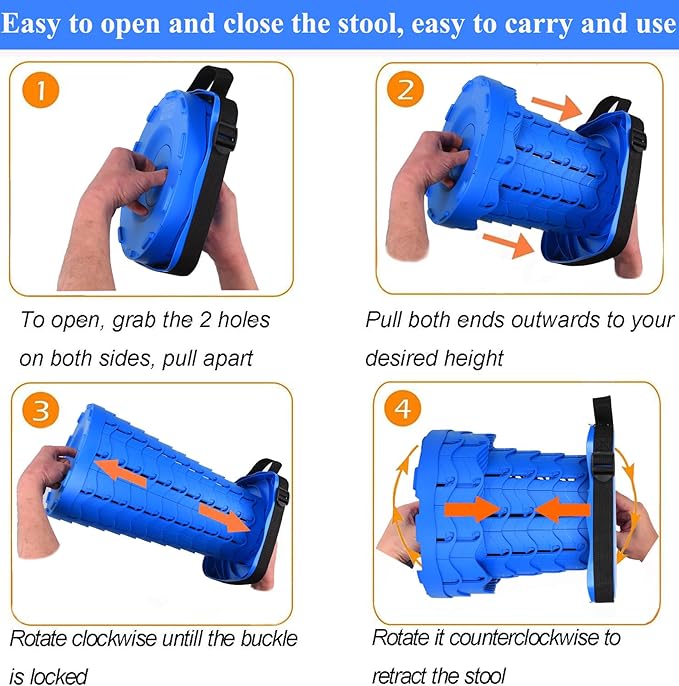 - [Easy to use, Multipurpose]: Super easy to use. You can open the collapsible stool by holding both ends and pulling to open with slight turning them, perfect for outdoors: drawing room, garden, hiking, BBQ, camping, queue, fishing, kitchen, etc