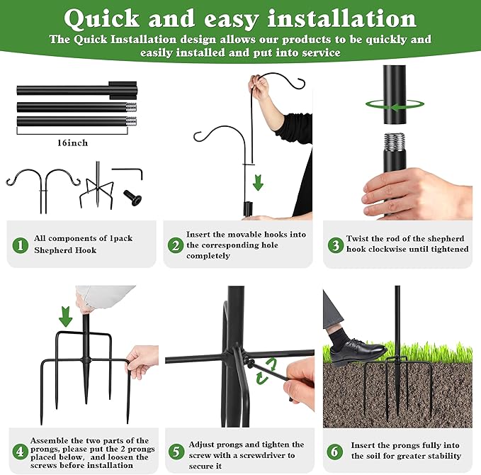 - Easy to Assemble & Use: Our bird feeder pole is quite easy to install or remove down, each metal bird feeder hanger rack includes 1 base prongs, 2 hook arms and 3 high-quality steel pipes. They can easily be assembled in a matter of minutes, just simply spin the ends of the extenders??poles together and finish assembly. Our shepherds hooks for hanging basket and bird feeder occupies a small space, and convenient for storage.