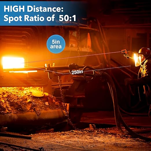 • 【Further Distance 50:1 + Dual Laser Point】With distance to spot ratio 50:1, you can measure high temperatures from a safe distance without getting too close to the heat source, ensuring both convenience and high safety. Dual non-contact digital lasers for instand targeting, allows you stand further from heat to measure high temperature. Instant capture hot spot and measure within 0.5 second only