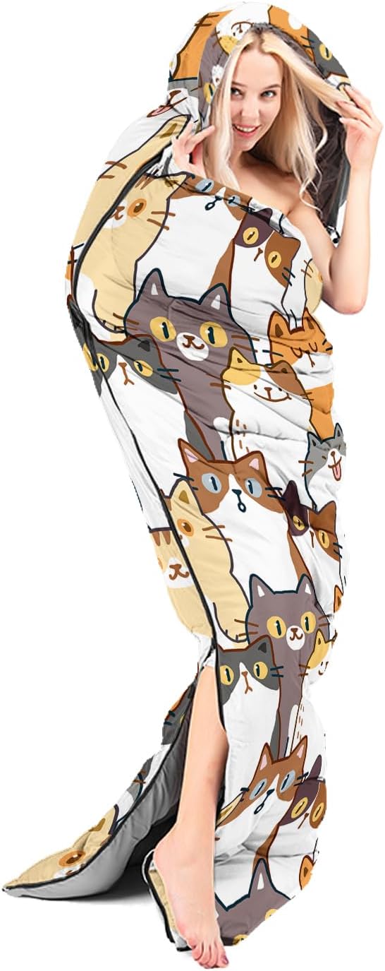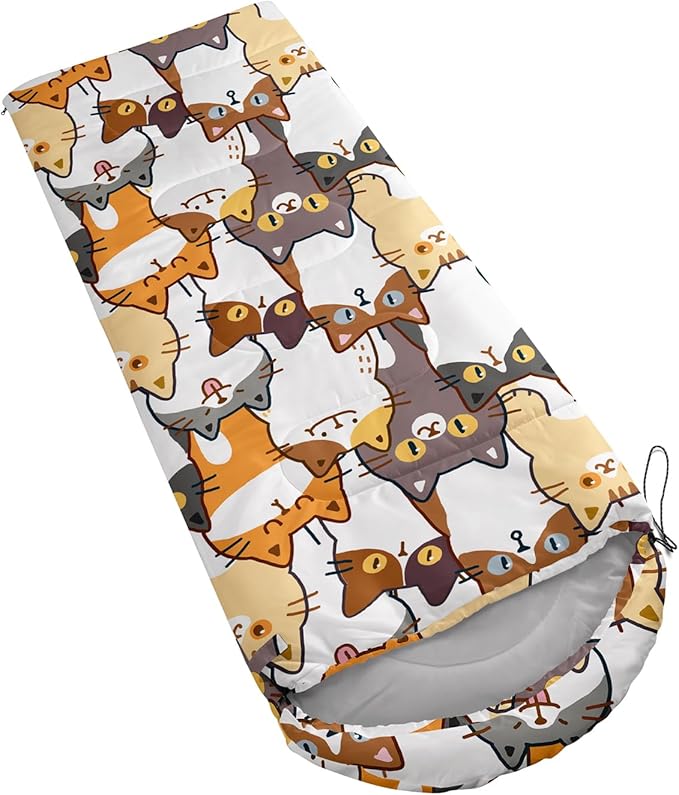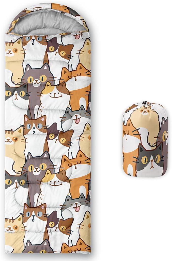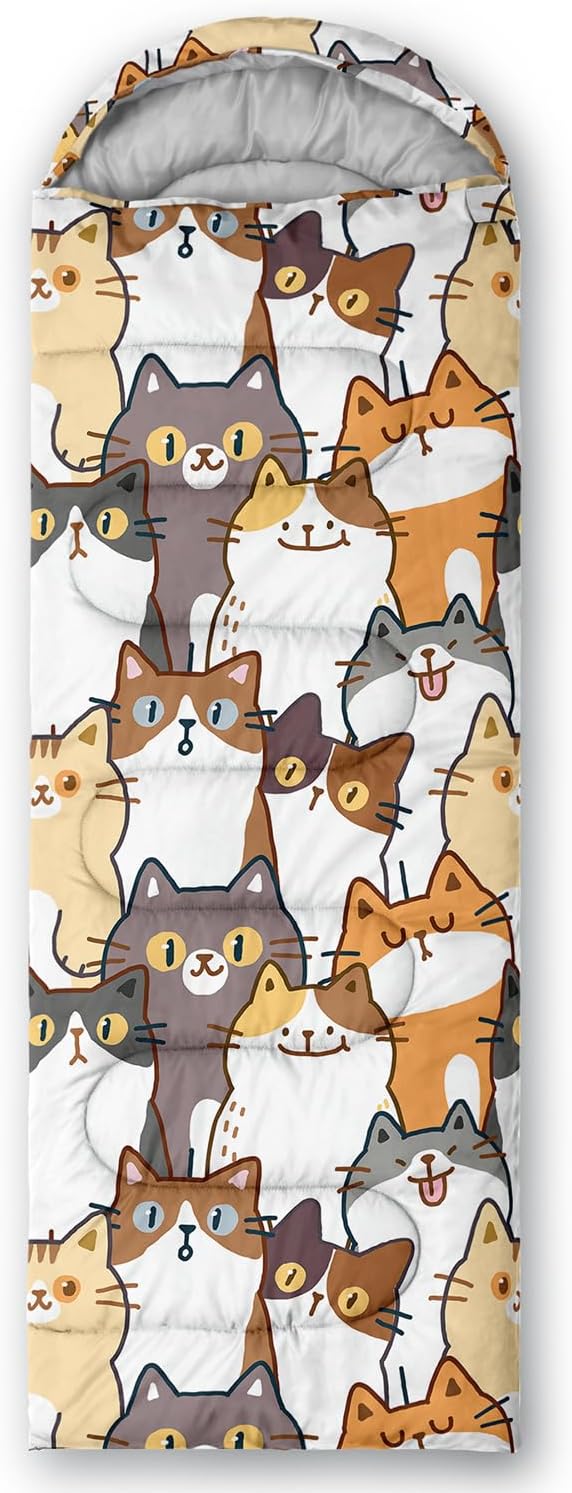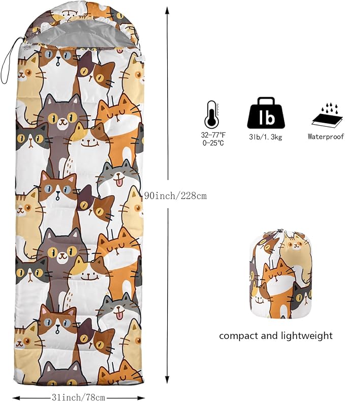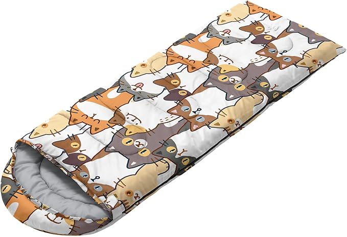 - Kawaii Cute Cat sleeping bags For All Seasons- Our camping sleeping bags are designed to give you a good night's sleep. Ideal for spring,summer,fall,and winter,rated from 32°F to 77°F (optimal comfort temperature is 50°F to 65°F). Stay comfortable and warm in any condition at normal altitude. Can be used for any outdoor adventure,class camping,summer camps,couch surfing,indoor blanket,and as an emergency blanket for vehicles.