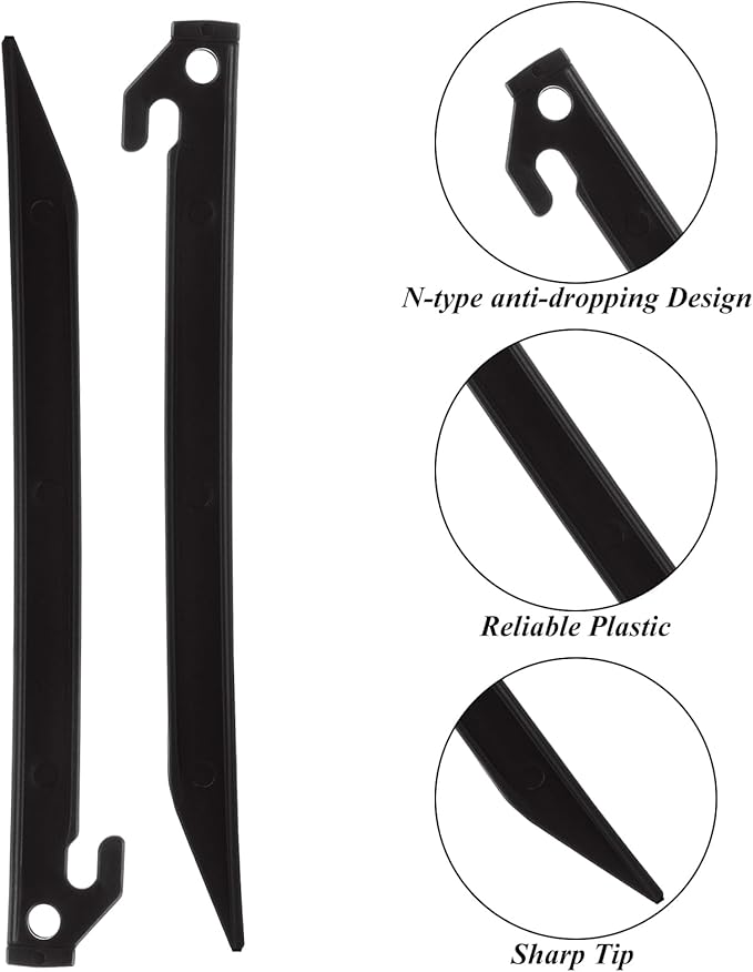- Premium Materials: These tent stakes are made of high-quality PP plastic, these stakes are built to last, with a sturdy structure that resists breaking and fading. Unlike metal, this plastic tent stake won't rust or deteriorate, ensuring reliable performance throughout your outdoor adventures