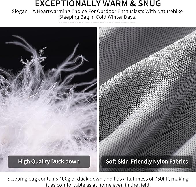 - 【Reliable Customer Service】Naturehike goose duck sleeping bags will be your perfect companion. We strongly support the exquisite craftsmanship of outdoor camping gear and provide the best customer experience. If you have any problem, please contact us. We will respond to your concerns within 24 hours