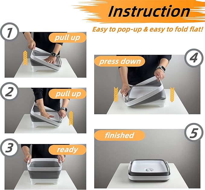 - Space-Saving & Portable: Expanding to 12 x 12 x 7.7 inches and folding to just 3 inches, this dish tub is ideal for compact sinks or other small areas. It easily folds flat for convenient storage, keeping your space tidy when not in use