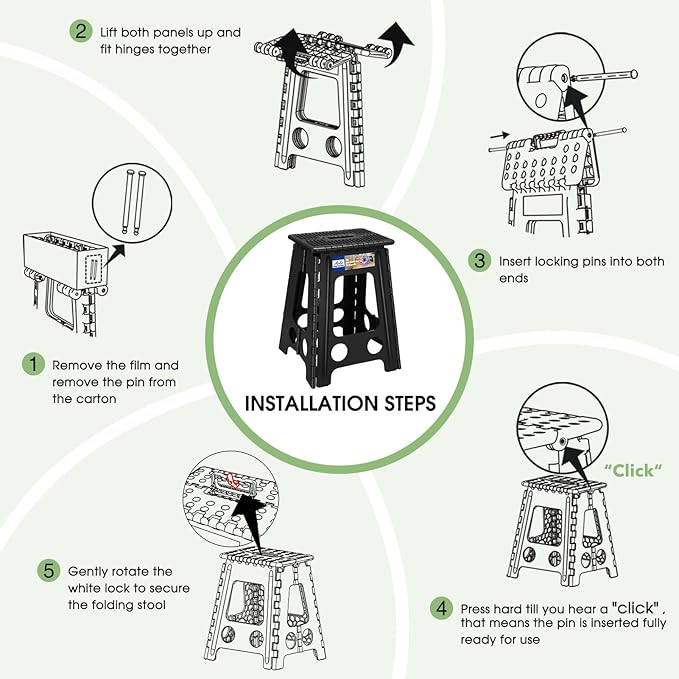 - 【Proper Use and Customer Serve】The plastic step stool must be used on a dry and flat surface.Ensure that the stool is fully open before use and that you hear the Pins fixing "Click" sound.Don't stand on the edget of the stool with one foot or tiptoe.Don't move stools while in use.Our warranty is 3 months with proper use.Customer service Available 24/7.If the pins lost unexpectedly, please do not hesitate to contact us for a replacement.