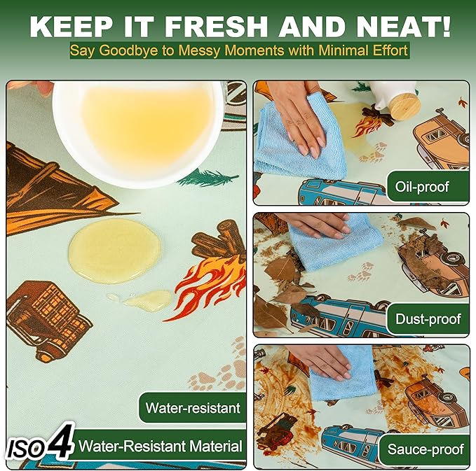 - EASY TO CLEAN: The camping table clothes are water repellent and stain resistant. Users can clean the spills like ketchup, wine, and grease with a simple wipe (works better using a wet towel).