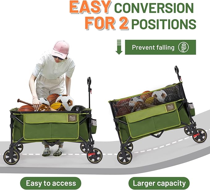 - PUSH&PULL: This folding wagon offers ample hauling capacity; adjustable handle for customized height; 360° swivel front wheels for easy steering and maneuvering
